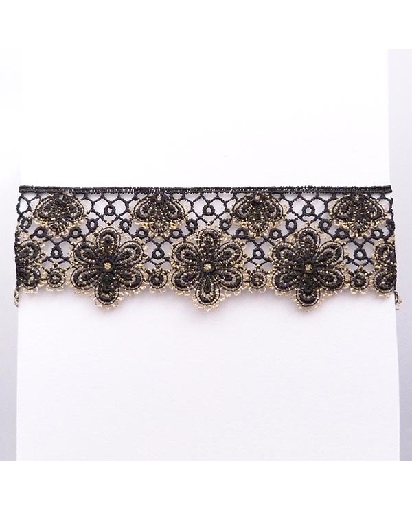 Une ambiance rétro très élégante avec ce collier ras de cou en dentelle florale noire et dorée, une pièce délicate qui incarne l'élégance du passé. Avec une largeur de 3,5 cm, ce collier offre une touche distinctive à chaque tenue.