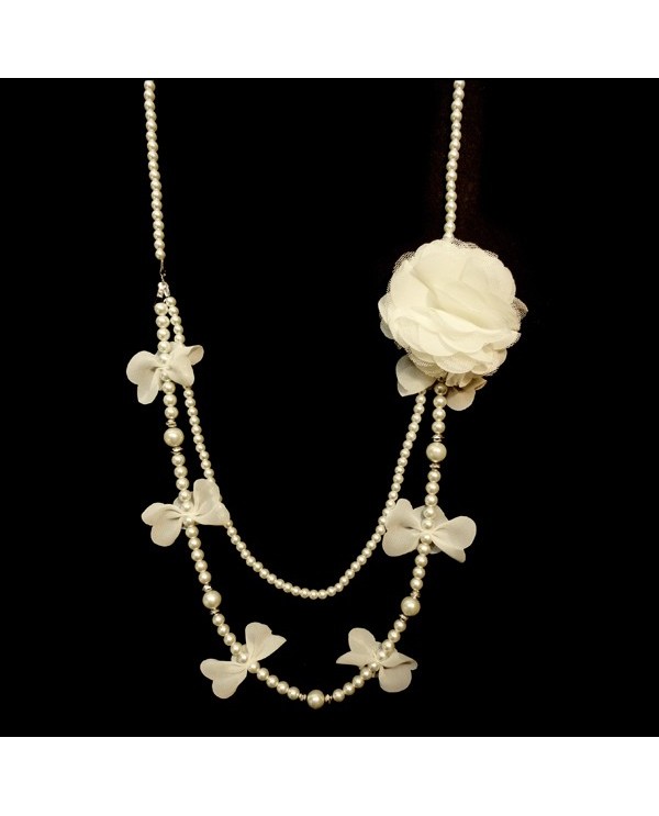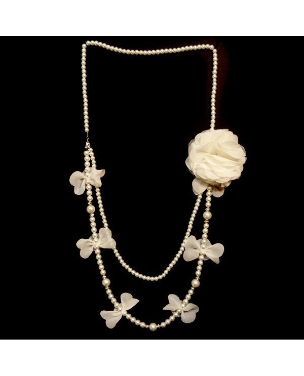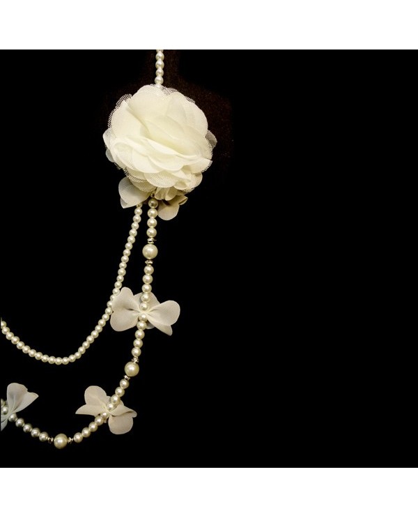 Collier en sautoir de couleur Blanc cassé. Perles nacrées imitation culture. Broche fleur en tissu séparable du collier.