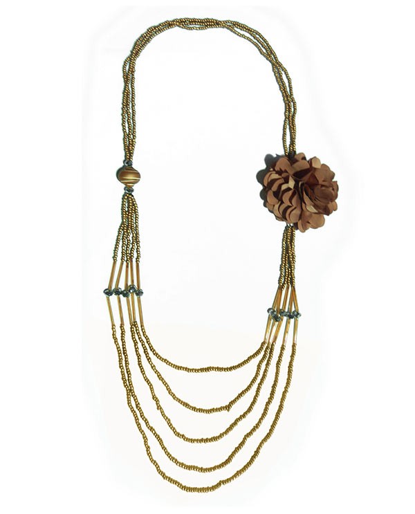 Un élégant sautoir multirang dans les tons de doré, en fines rangées de perles dorées matifié (comme cela est un peu mat, c'est festif sans être trop clinquant. Une broche, séparable, de couleur marron l'habille encore plus. pour les fêtes, vous pouvez la porter sur une robe pour un style rétro, un peu années folles ou sur un pull si vous êtes plutôt du genre sobre.