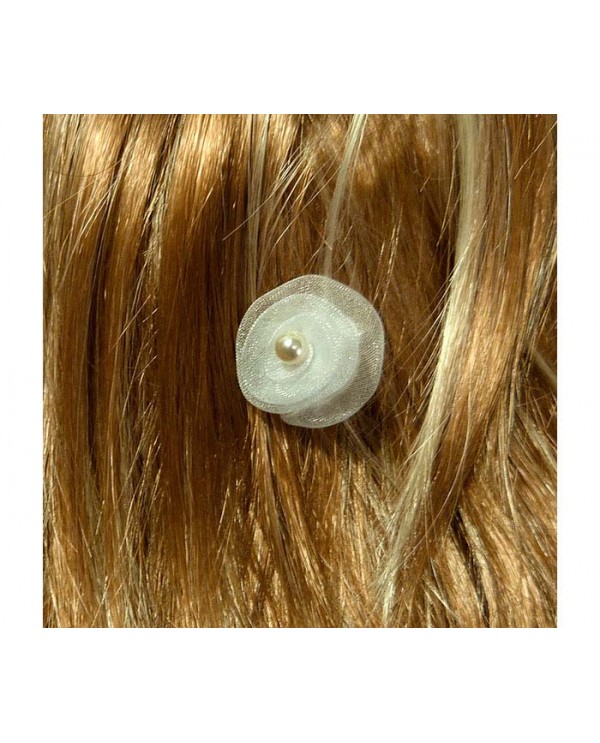 Sur chaque épingle, un petit tourbillon en organza blanc, une perle nacré d'imitation culture couleur blanc cassé.