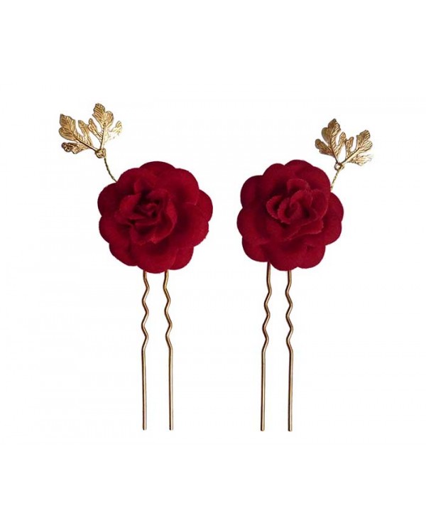 Sur chaque monture d'épingle doré, une belle fleur de camélia rouge en tissus toucher velours. Des fines feuilles dorées donnent une touche de brillance à l'ensemble.