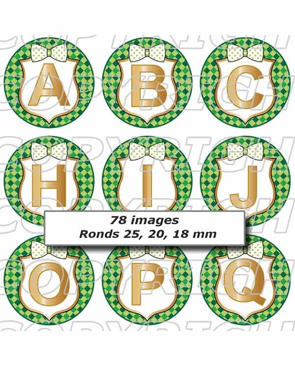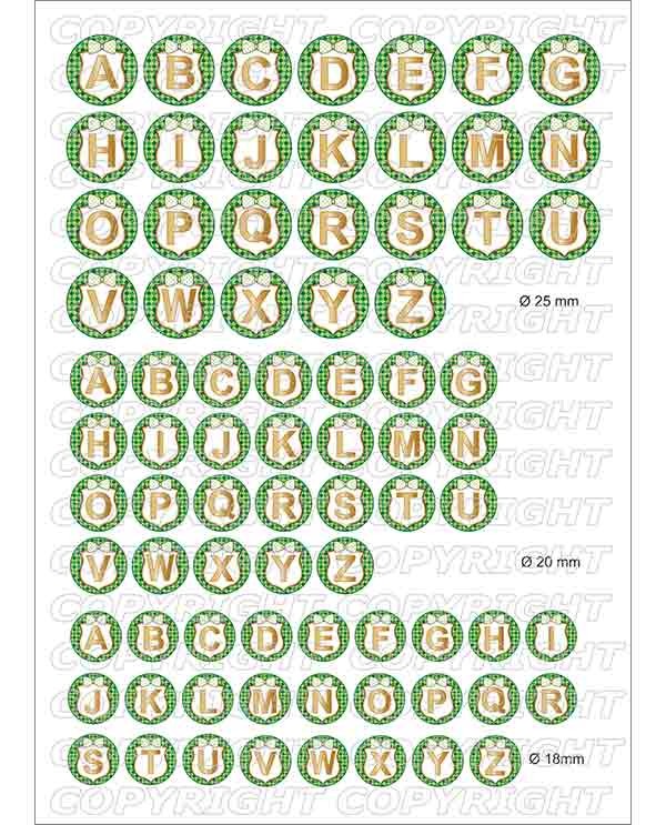 Alphabet, lettres dorées dans un blason sur fond de carreaux vert.