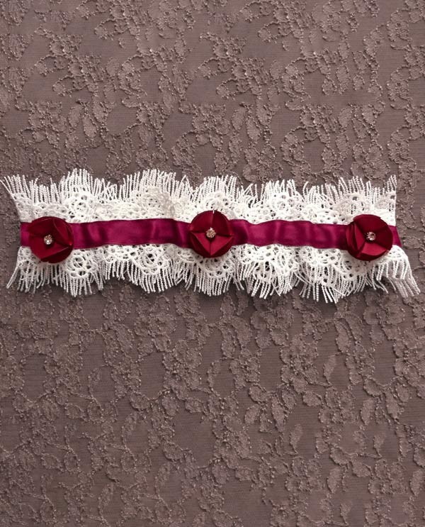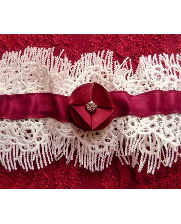 Jarretière très élégante en dentelle blanc cassé et satin bordeaux.
