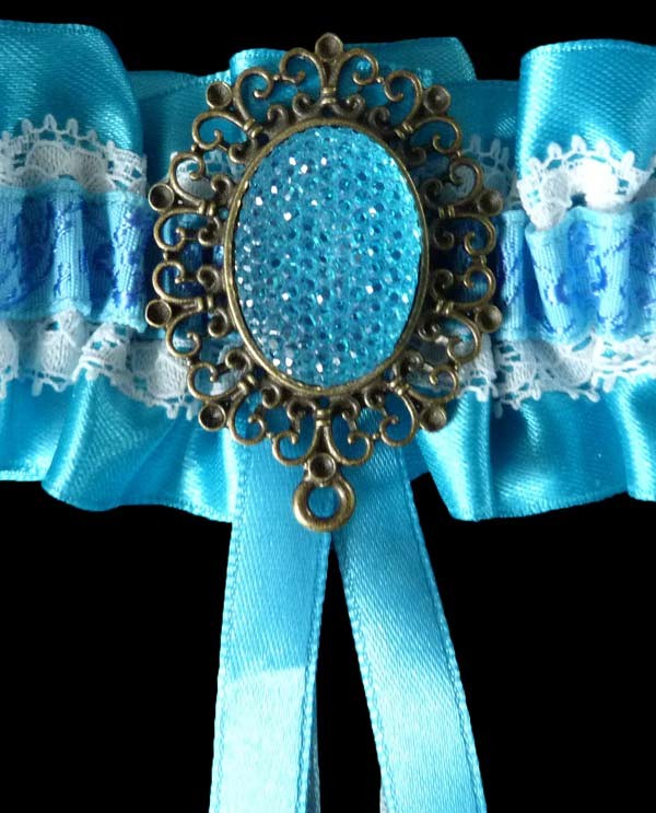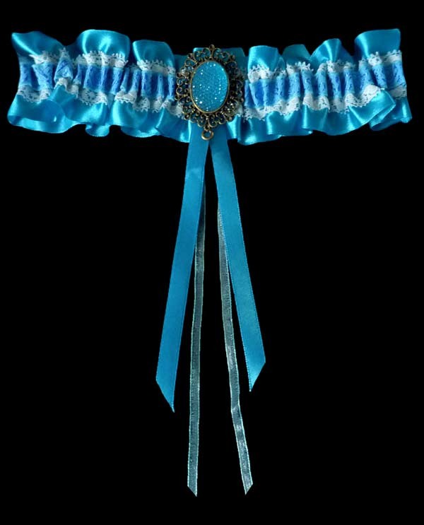Jarretière baroque couleur azur. Si la marié est en blanc et veut un accessoire en bleu, elle pourra cacher cette touche de couleur sous ses jupons.