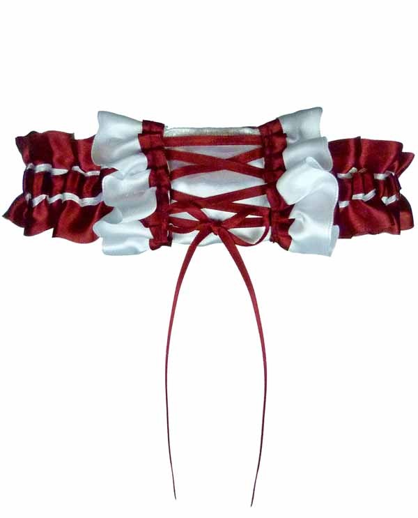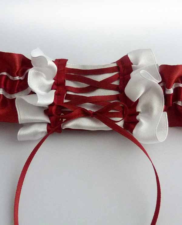 Pour un clin d'oeil coquin et pourquoi pas un brin humoristique, un faux laçage en fin rubans bordeaux, et des plissés froufroutés blancs, sont les caractéristiques principales de cet accessoire de la mariée