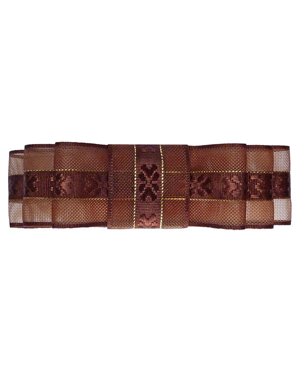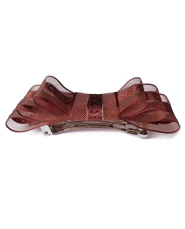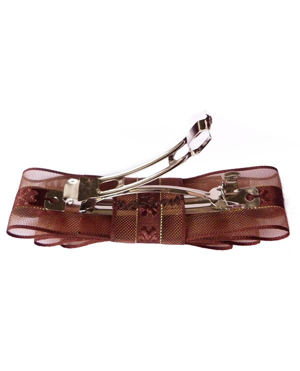 cette barrette marron chocolat est en forme de noeud. Les multiples noeuds superposés sont fait d'un tissu brodé au centre avec des bords résille ton sur ton, séparés par un très fin liseré doré.