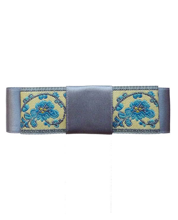 Barrette pour femme, de style baroque. Un noeud plat élégant beige brodé de fleurs, ensemble dans des tonalités colorées de bleu-gris.