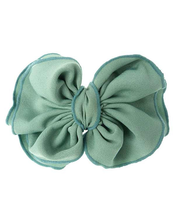 Pince a cheveux pour femme, avec un grand noeud papillon plissé en tissu vert tirant vers le bleu.